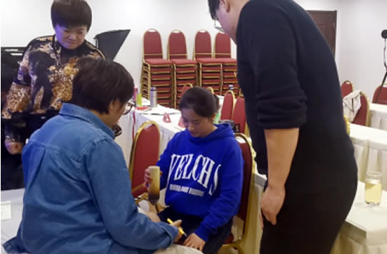理论之后天同老师带领大家实操。先教大家识穴位,然后每人在model上找穴位,最后实操灸法。在灸的过程中三人一组,每人都要体验到灸感“透热->散热->传热->远端热”。